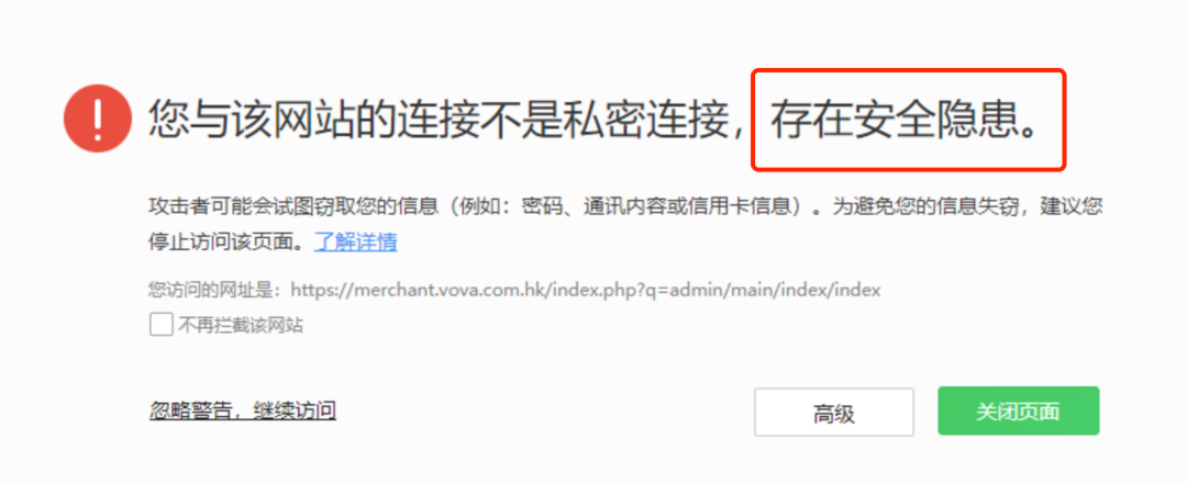 卖家后台本来还是唯一希望。但是,这两天,当卖家打开Vova商户平台链接尝试登陆的时候,发现登陆页面要么是空白页面,要么提示网站存在安全隐患。总之,卖家后台打不开,平台大概率是服务器没有续期,已经彻底完蛋了!