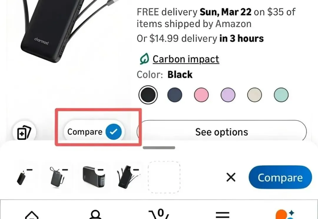 美国站移动端前台,悄悄上线了由Rufus AI驱动的Compare对比按钮!