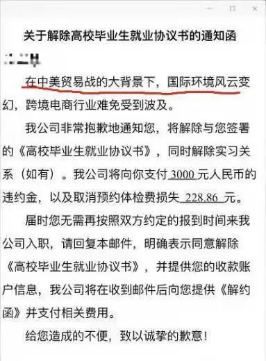 值得注意的是,上一轮大卖店铺接连被封事件,亚马逊圈卖家们仍历历在目。受此影响,近日,卖家群还流传出一张深圳某大卖解除高校毕业生的就业协议通知函,通知内容耐人寻味,详见下图: