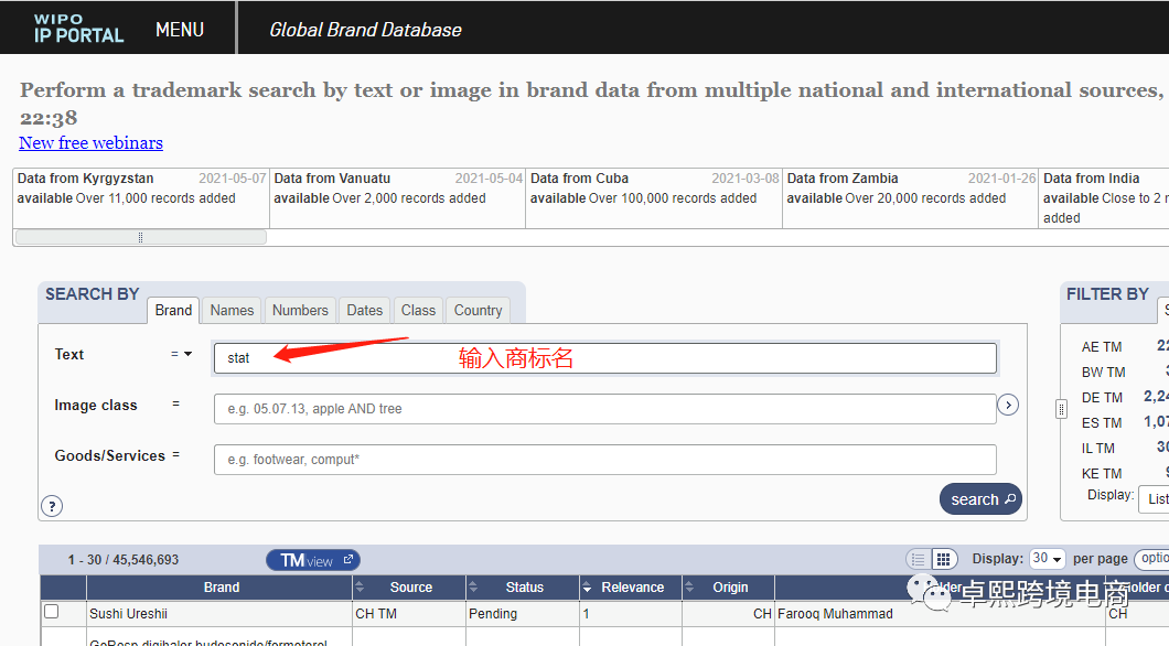 1、进入世界知识产权组织数据库查询信息(网址:https://www3.wipo.int/branddb/en/)