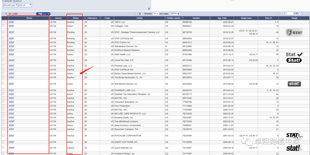 3、初步判断商标的状态,"inactive"代表死亡,"Aactive"代表注册成功,"pending"代表注册中的商标;