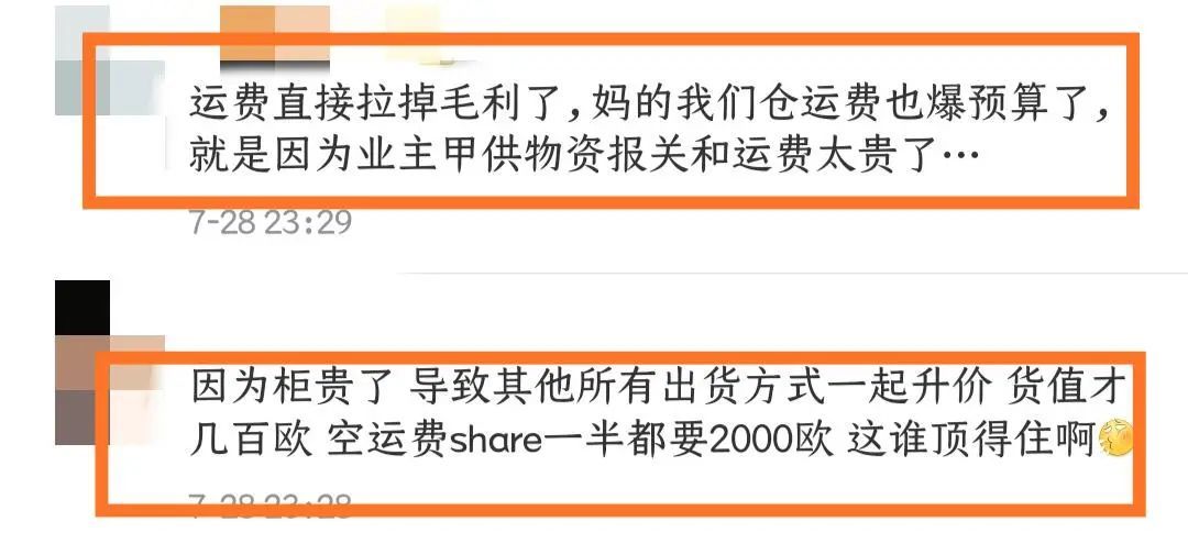 但有卖家吐槽:"即使提前订拿了舱位也没用啊,船晚开又不晚截单…没开港装完箱也得落箱…落箱费都翻倍了…别说还有别的超期用箱费和堆存费,美线欧线运价成本太高了…我一个大柜落箱半个月了还没开港…伤不起啊!"