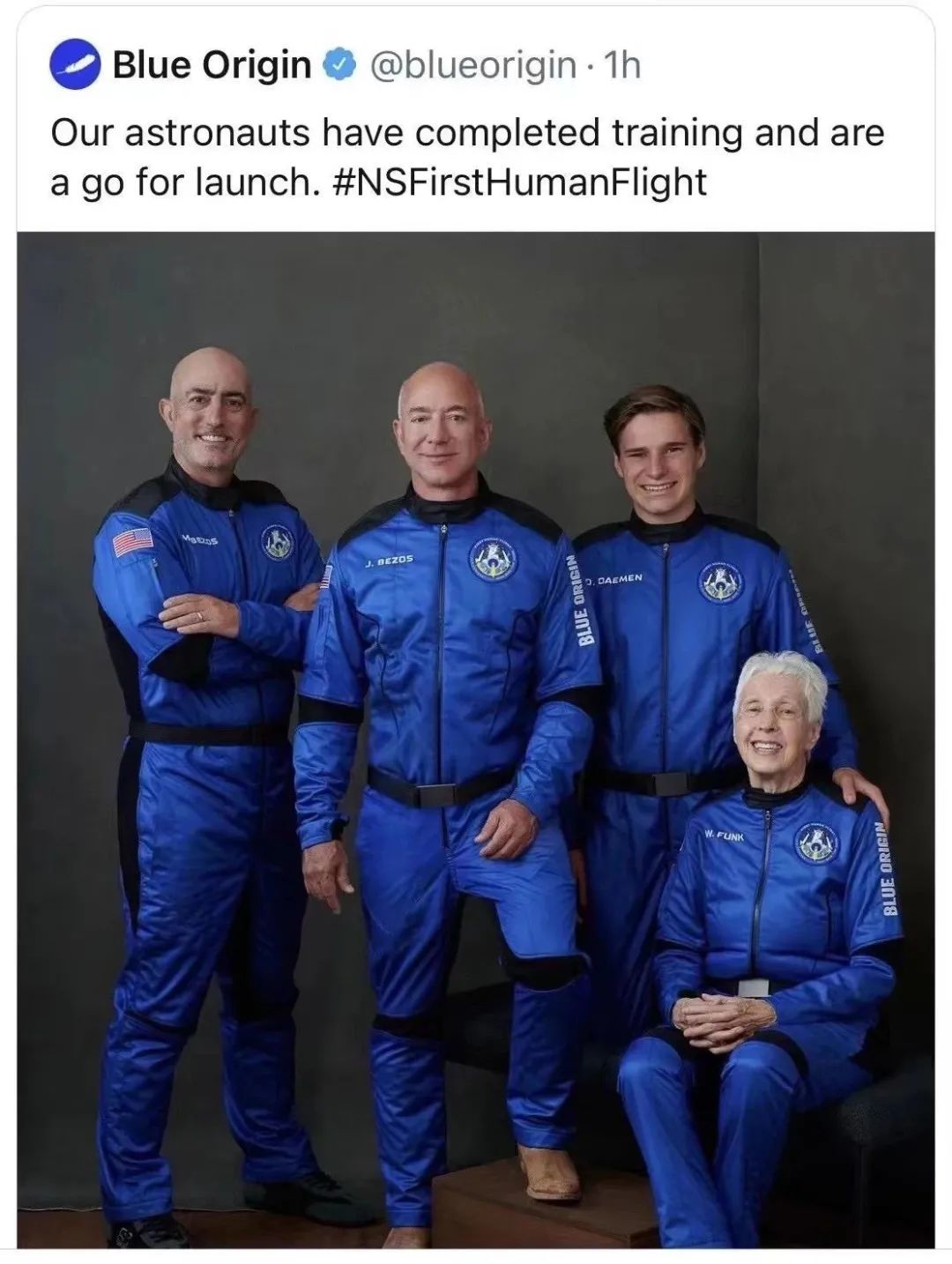 与贝索斯同行的还有其兄弟马克·贝索斯(Mark Bezos)、82岁女飞行员沃利·芬克(Wally Funk)以及18岁学生奥利弗·戴曼(Oliver Daeman)。