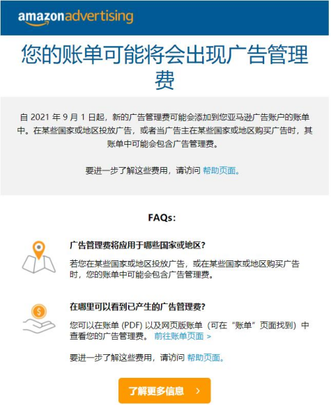 从文件内容可以看出,自2021年9月1日起,新的广告管理费可能会添加到卖家的亚马逊广告账户的账单中。在某些国家或地区投放广告,或者广告主在某些国家或地区购买广告时,其账单中可能包含广告管理费。