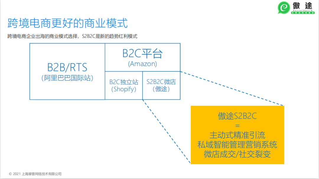 因此,傲途的S2B2C社交私域营销解决方案来了。熟悉傲途的朋友们都知道,在前有外贸B2B平台(如阿里巴巴国际站RTS)、外贸B2C平台(如亚马逊)、外贸独立站(如Shopify)等渠道和平台如火如荼的情况下,傲途将整个市场再做差异化切分定位,精心打傲途S2B2C三板斧,以先天差异化优势精准出击。
