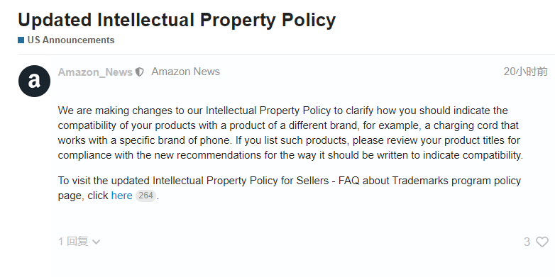 前段时间,亚马逊发布公告称,更新知识产权政策,以帮助卖家描述自家产品与其他品牌产品的兼容性,以避免知识产权问题。