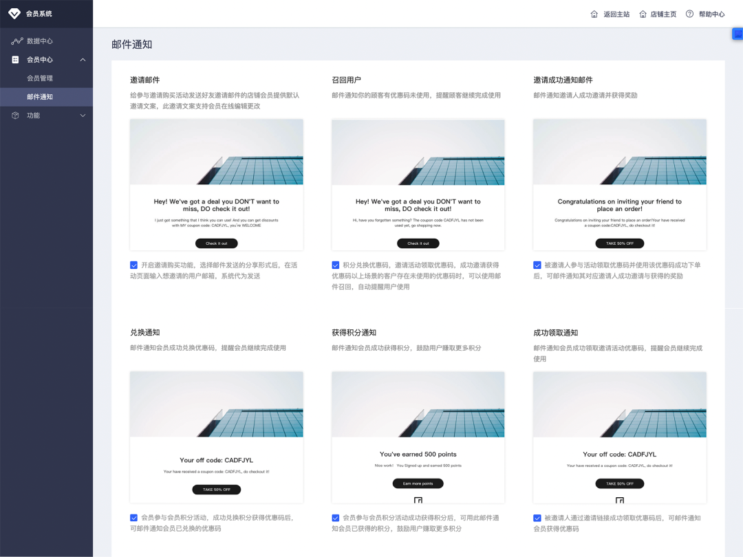 - 兑换通知:邮件通知会员成功兑换优惠码,提醒会员继续完成使用;