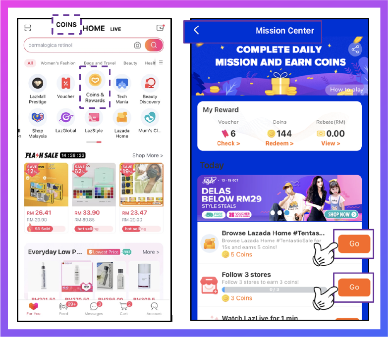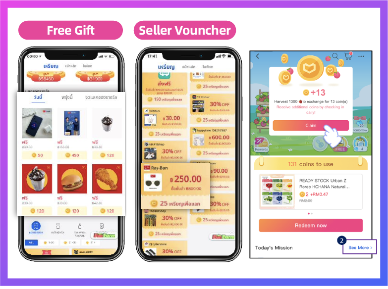 LazCoin内置了FunFarm(开心农场)、每日任务等游戏,农场养成类游戏吸引消费者长时间留在平台上玩游戏,同时通过提升游戏内成就兑换免费礼品、Flexi Coin以及专属优惠券,优惠活动可再次返回店铺下单使用,以此促进更多潜在成交和提升消费者进店后的成交转换率。