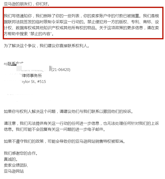 亚马逊在警告邮件中告知,根据联邦法院签发的临时限制令,该卖家涉嫌商标、专利等侵权,因此下架其部分产品,冻结了账户资金。