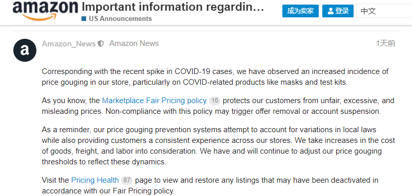 为此亚马逊平台美国站在1月19日发布公告,提醒卖家公平定价,以此来保护亚马逊买家因为哄抬物价导致消费者受到过高或者不公平的价格对待。