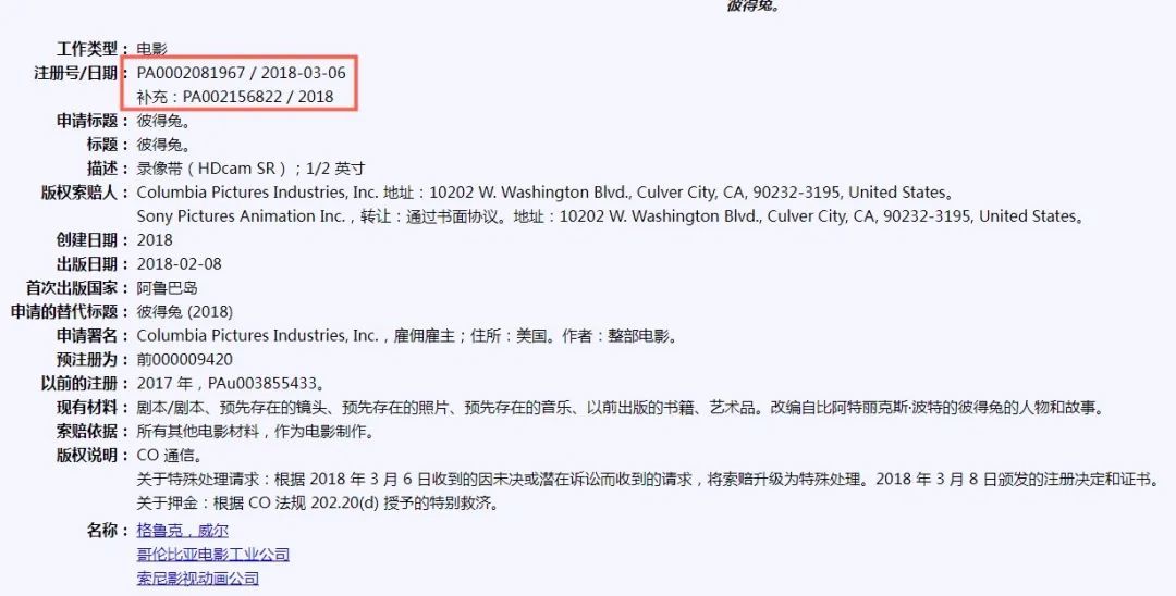 这是一部2018年的3D动画喜剧电影,有威尔·格鲁克导演。我们都知道,所有电影的角色和道具都受版权保护的,那么通过检索后我们发现这部动画在上映的同年就申请了美国版权保护,所属人为索尼影视动画公司。