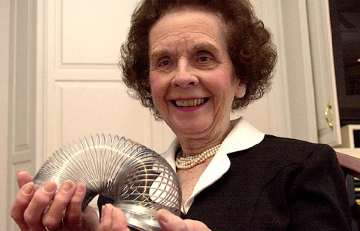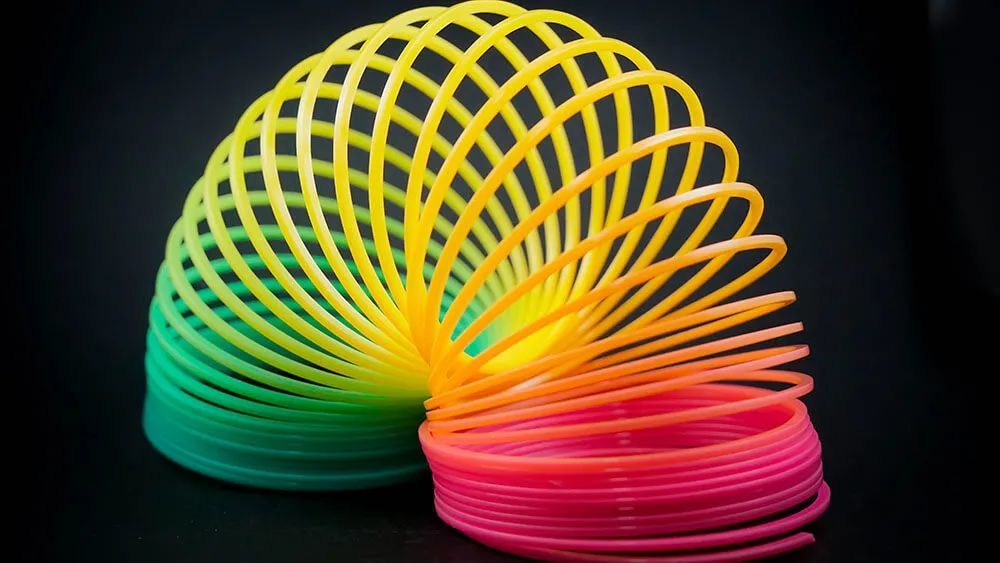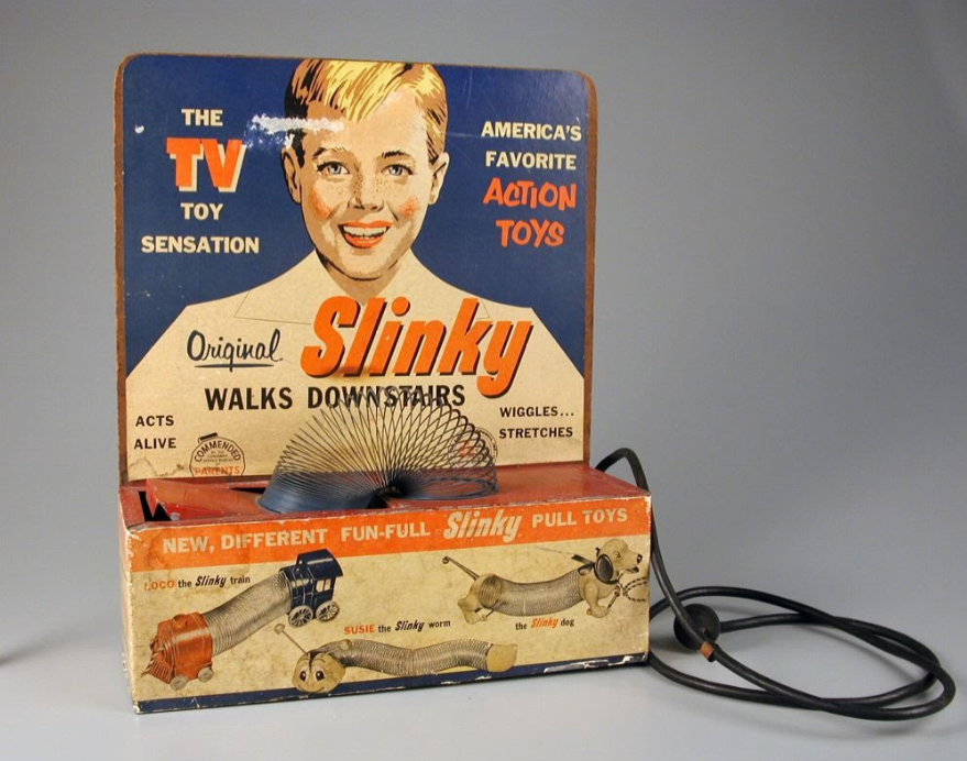 这一幕让Richard Jame的妻子Betty突发奇想,她采用了多种金属材料不停做实验,最终耗时一年,将这个简单的螺线圈制造成了可以自己下楼梯的玩具。随后,夫妇俩给它起了一个非常美妙的名字——Slinky,意为优美,圆滑和蜿蜒的。