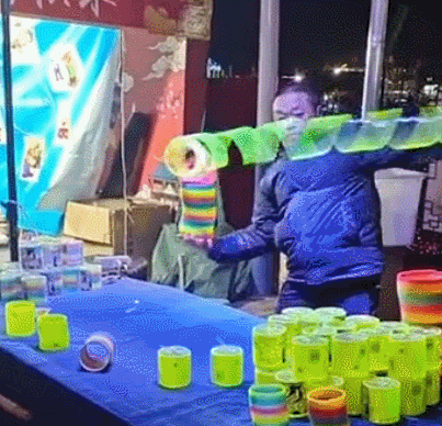 在国内不少景区,夜市,乃至社交媒体上,人们经常能看到这种玩具——当卖货人耍起这种五彩缤纷的螺线圈时,场面会非常奇幻。