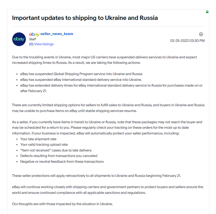 近日,eBay已经宣布暂停向乌克兰和俄罗斯提供发货服务。暂停了两个地区的Global Shipping Program(全球运输服务)和乌克兰地区的international standard delivery service(国际标准运输服务)。