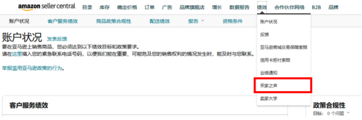 01因负评停售后,如何快速重新上架登录"买家之声":亚马逊的【卖家平台】- 导航栏【绩效】点击【