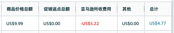 以上面截图中为例,售价$9.99的产品,亚马逊收取的费用是$5.22,总计(余额)$4.77是卖家在这个订单中真实收到的钱。