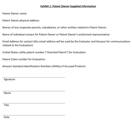 专利权人需要先提出侵权投诉并向马逊提交一份《亚马逊专利中立评估协议》(Amazon Utility Patent Neutral Evaluation Agreement)。在附表中1(如下图)填写专利号,联系方式等必要信息。