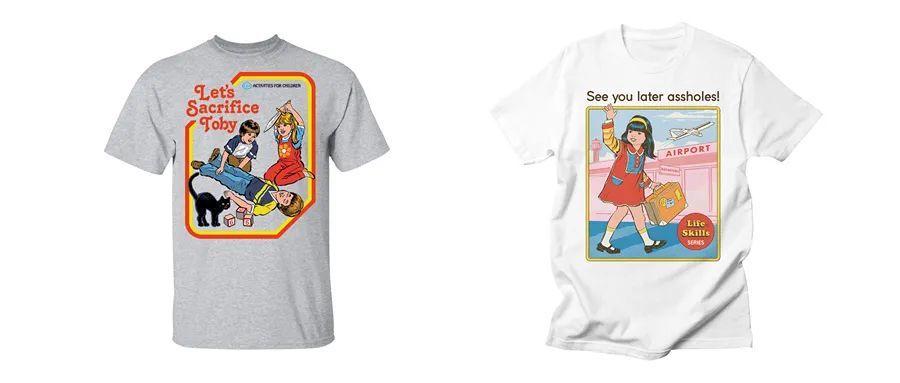 原告STEVEN RHODES是一位澳大利亚的插画师,他的作品带有浓郁七八十年代的怀旧风格以及黑色幽默。他最畅销的T恤和商品在多个国际零售商均有出售,如Spencer's、Hot Topic和HMV。具体作品,大家可以登陆原告官网查看