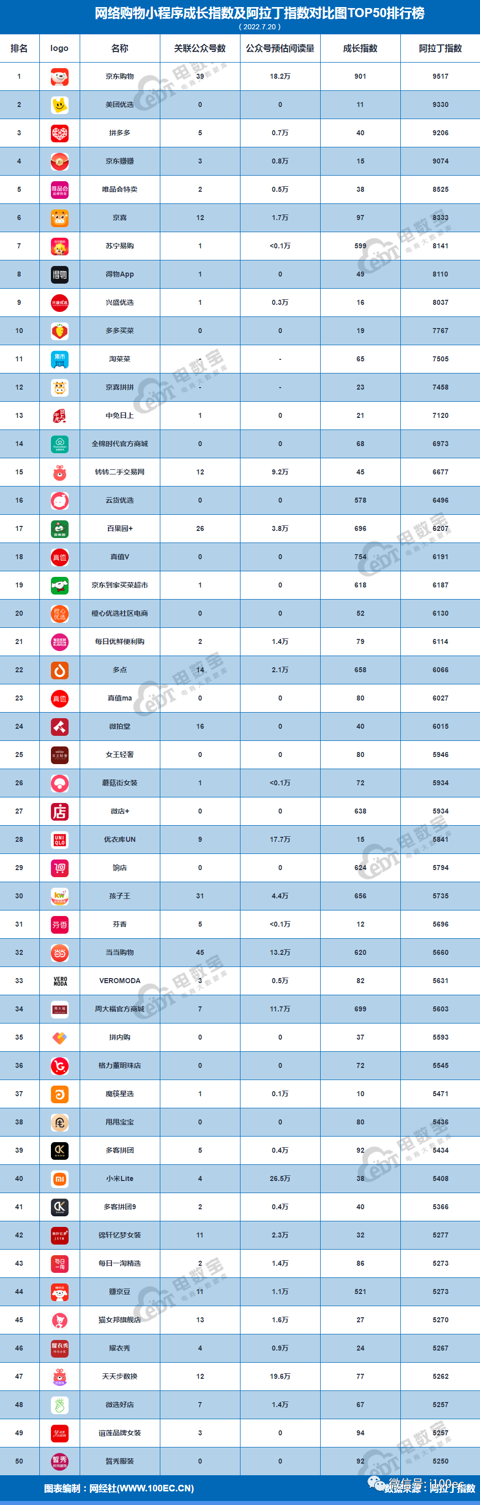 导读:7月20日,我国"一带一路"TOP10影响力社会智库——网经社电子商务研究中心发布《7月网络购物小程序TOP50榜》,榜单根据"电数宝"(DATA.100EC.CN)电商大数据库编制而成,统计时间截至7月20日。