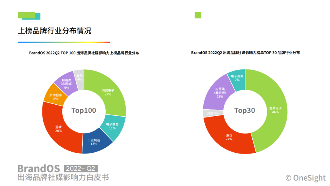 . 在 TOP100 上榜品牌中,28% 来自游戏行业,27% 来自消费电子行业;