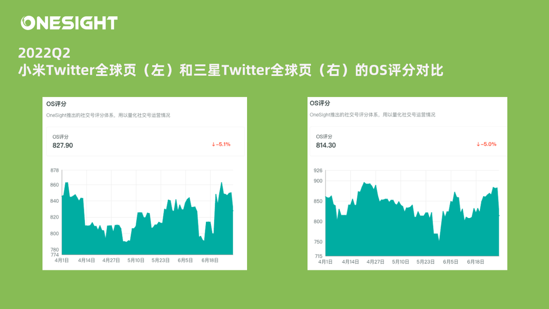 我们将小米的 Q2 最佳社媒主页—— Twitter 全球页与三星的 Twitter 全球页做对比可以发现,在主页粉丝数为百万级 vs 千万级(小米 400.21 万 vs 三星 1250.51 万)的前提下,小米的 Twitter 全球页仍然获得了 827.9 分的超高主页 OS 评分,而三星的 Twitter 全球页只有 814.3 分的主页 OS 评分。