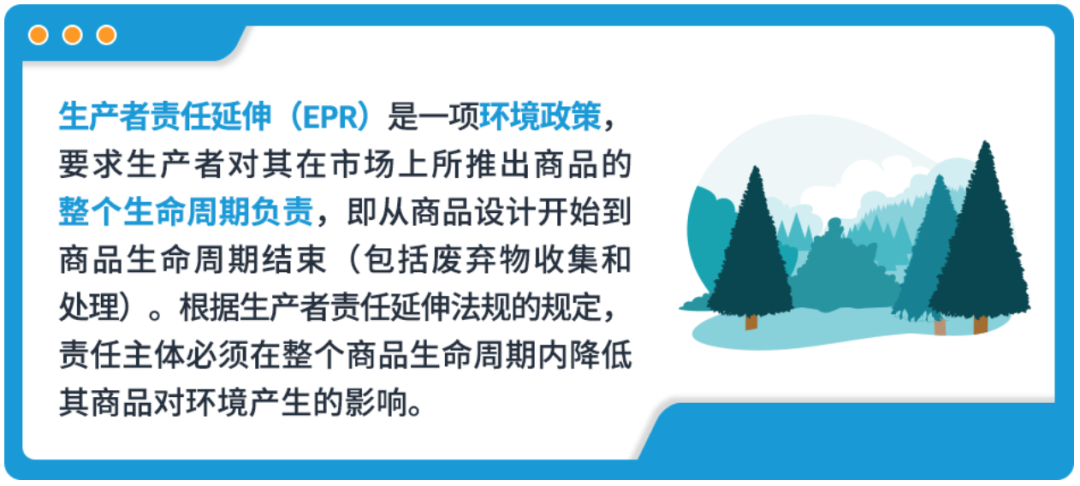生产者责任延伸(EPR)是一项环境政策,要求卖家对其在市场上所销售的商品的整个生命周期负责,根据生产者责任延伸法规规定,责任主体必须在整个商品生命周期内降低其商品对环境产生的影响。
