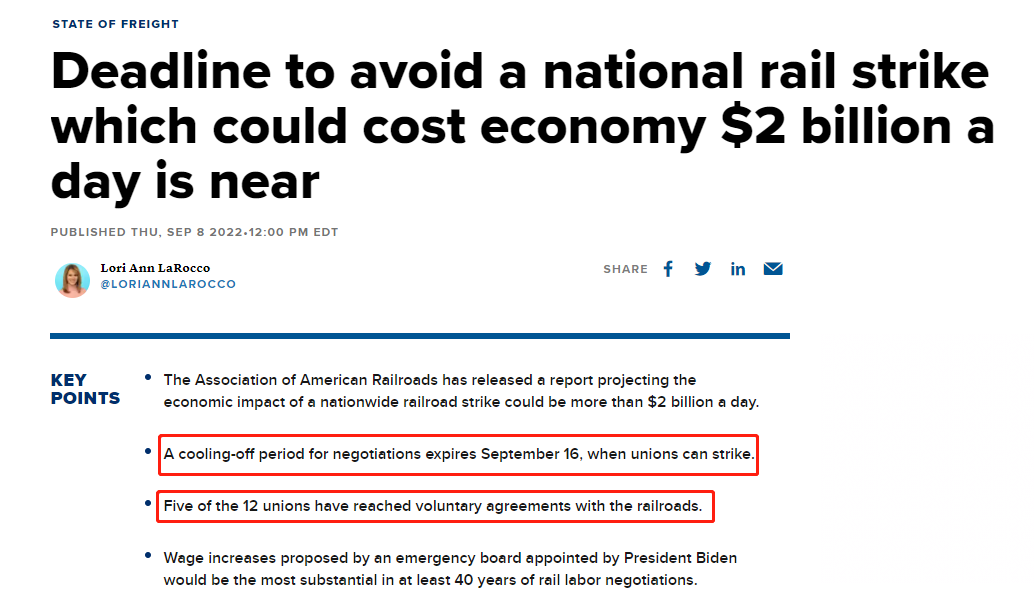 自7月拜登出手成立总统紧急事务委员会(PEB)介入铁路劳工谈判,"逼停"这场铁路罢工。但60天的"冷静期"即将于美国时间9月16日到期,工会和铁路公司的谈判代表将在美国时间周四和周五再次与国家调解委员会会面。