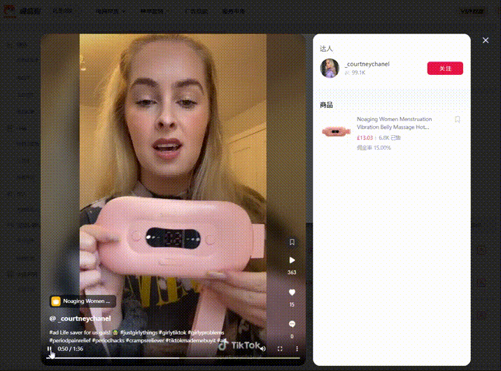 这款加热腰带的带货视频大部分由达人真人出镜介绍产品的使用方法和效果,分享自己亲自使用这款加热腰带的感受,如温度适中,有效缓解痛经等。并且,带货达人会在带货视频下方挂上小黄车,对该产品感兴趣的网友可以直接点击进行购买,操作方便,有效提高商品转化率。![]()