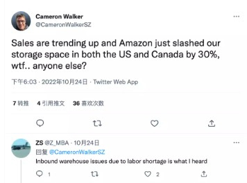 10月24日,一位亚马逊卖家发布推文称,其销售额正在呈上升趋势,其在亚马逊美国站和加拿大站的库容都被削减了30%。