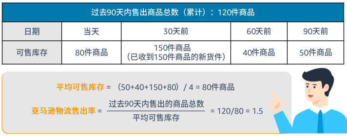您的亚马逊物流连续90天售出率等于过去90天售出,并已完成配送的商品数量除以该时间段内您在亚马逊运营中心的平均可售商品数量。亚马逊会通过当天、30天前、60天前和90天前的库存水平来计算您的平均可售商品数量。