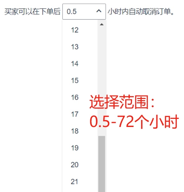 该功能允许卖家自主设置买家可自主取消订单的时间范围,在时限内买家可直接取消订单,超过时限则需卖家审核同意。系统默认时限为 0.5 小时,设置范围为 0.5-72 小时(以半小时为单位)。