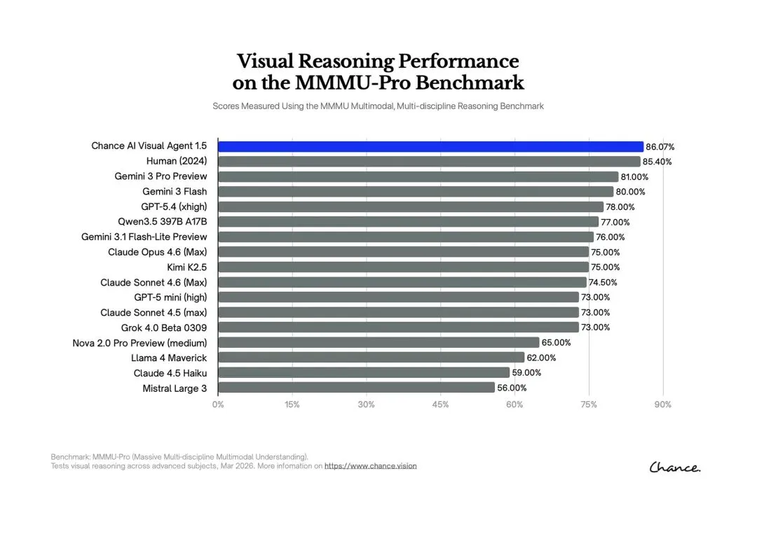 对图像的精准理解离不开Chance AI的技术突破。MMMMU-Pro 是目前最严苛的多模态基准测试之一,它通过过滤纯文本可解题、增加选项干扰,并将问题嵌入图像中,真正考察 AI 是否具备人类级别的视觉理解与跨学科推理能力,而非依赖模式匹配或文字捷径。Chance AI Visual Agent 在 MMMU 相关评测中以 86.07% 的准确率位列世界第一,在艺术理解、结构分析与跨语境解释等任务上表现优秀,甚至超越了人类在2024年的成绩。